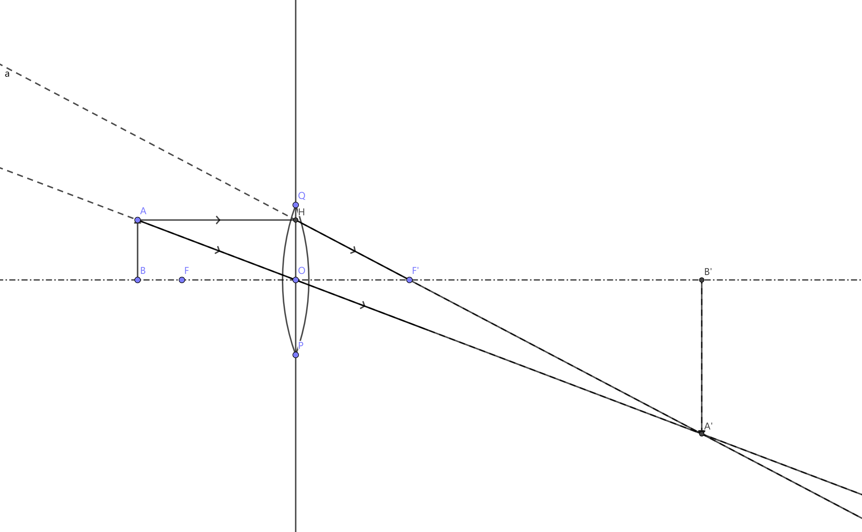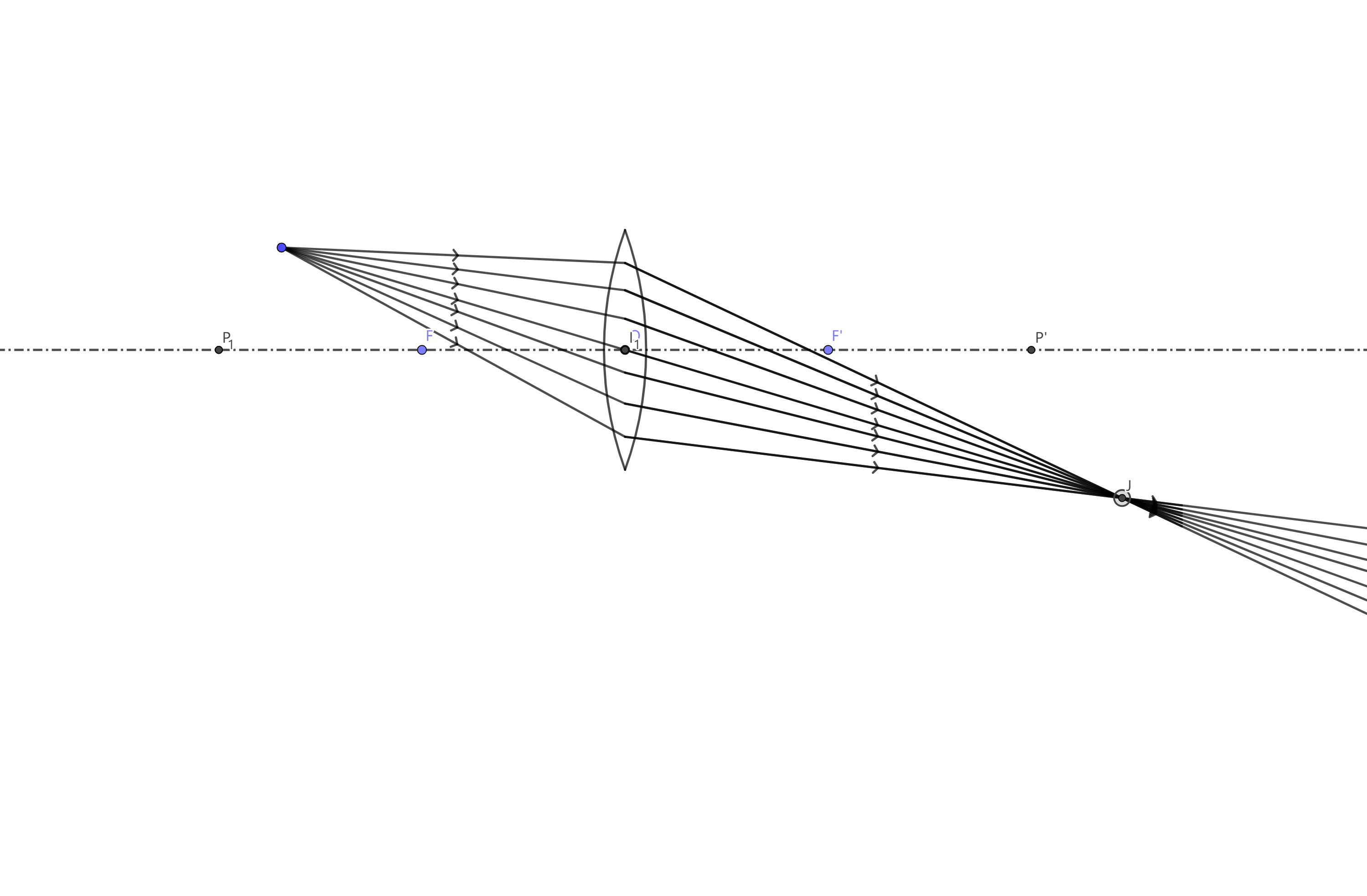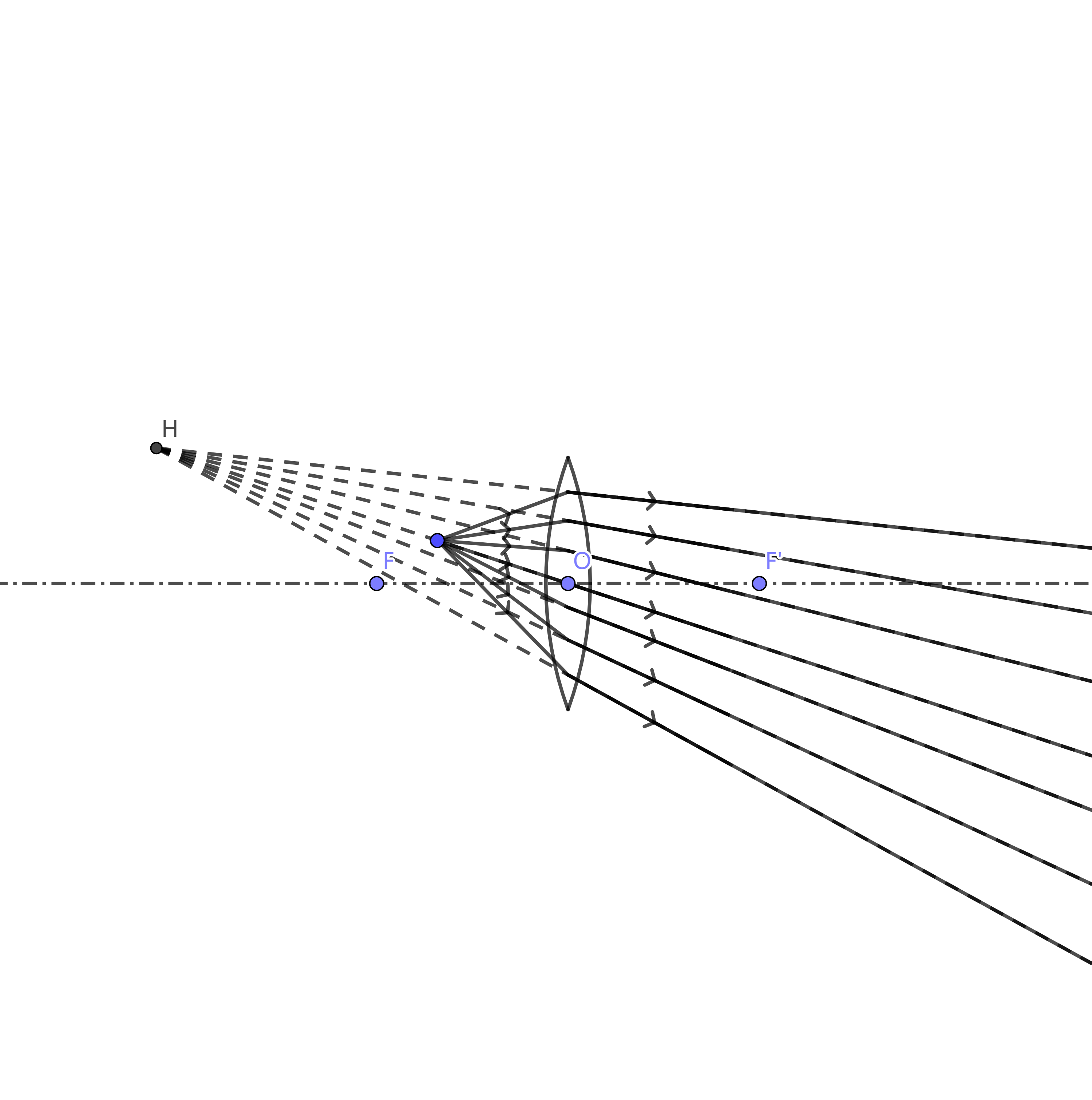此时经过凸透镜的光线的反射延长线交于H点,这个点光源会在H点成虚像。由于光线会比原来汇聚,所以H点到透镜的距离会大于点光源到透镜的距离。 - 当点光源位于一倍焦距之外是,光线是这个样子的。