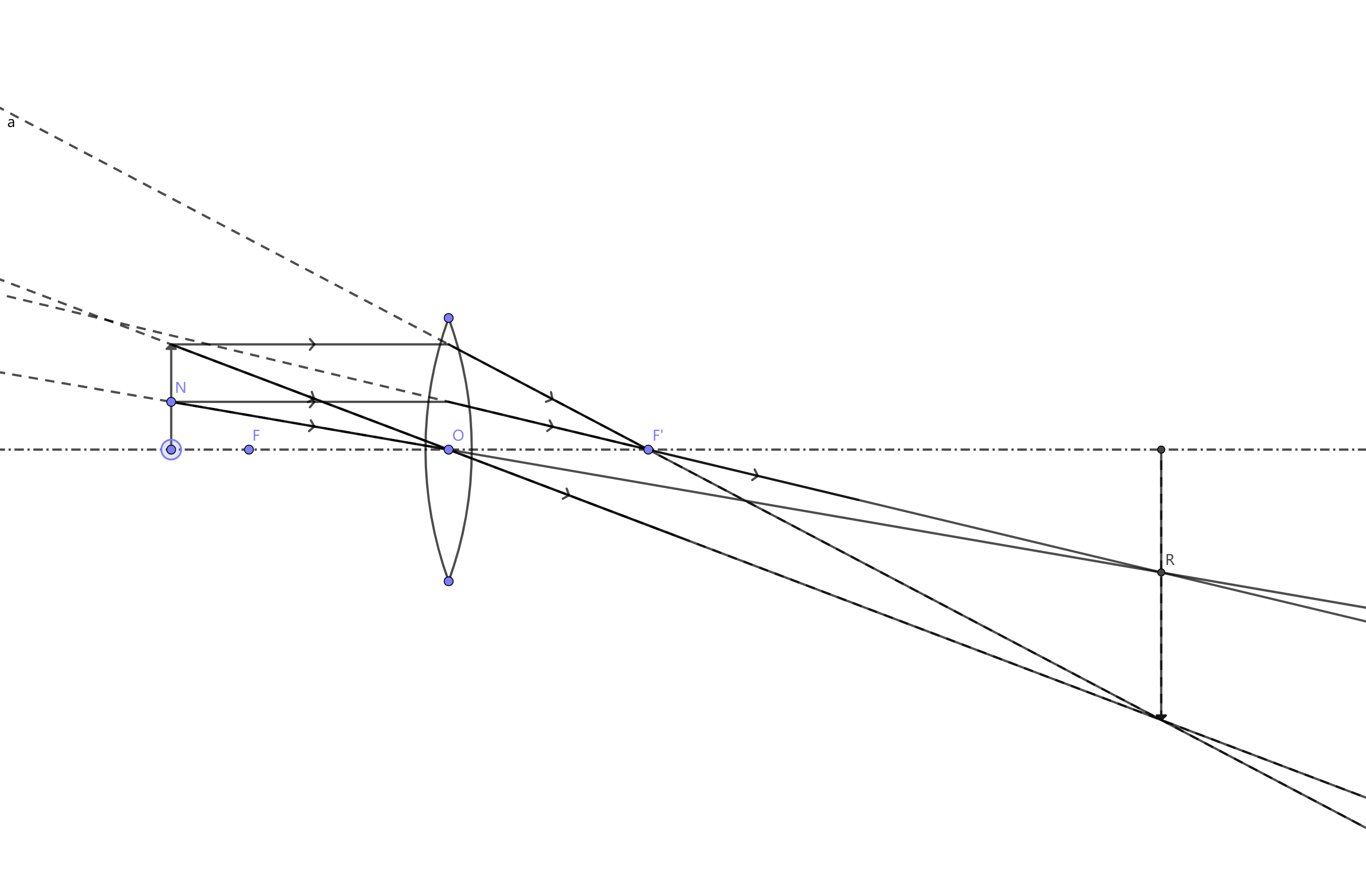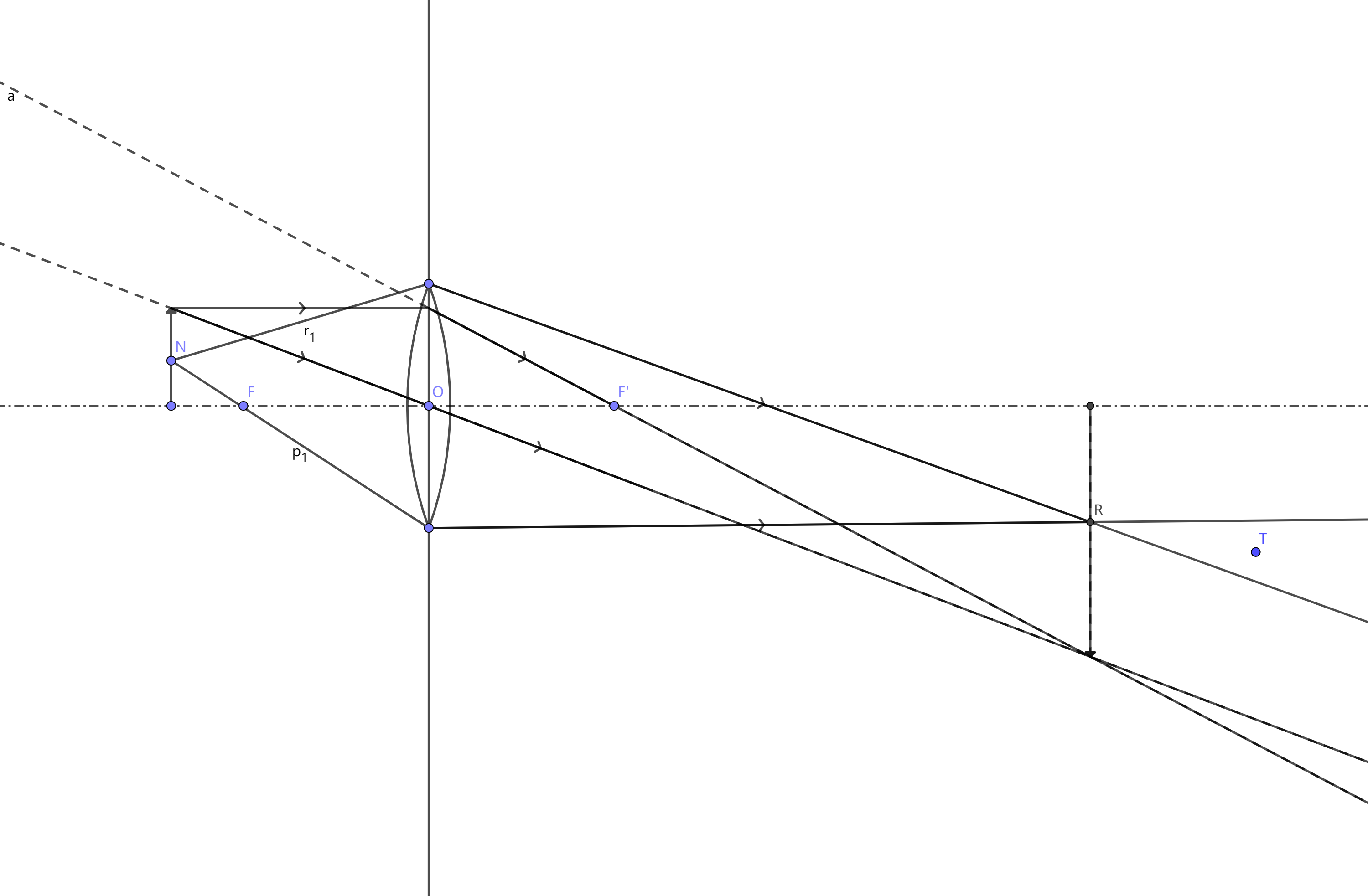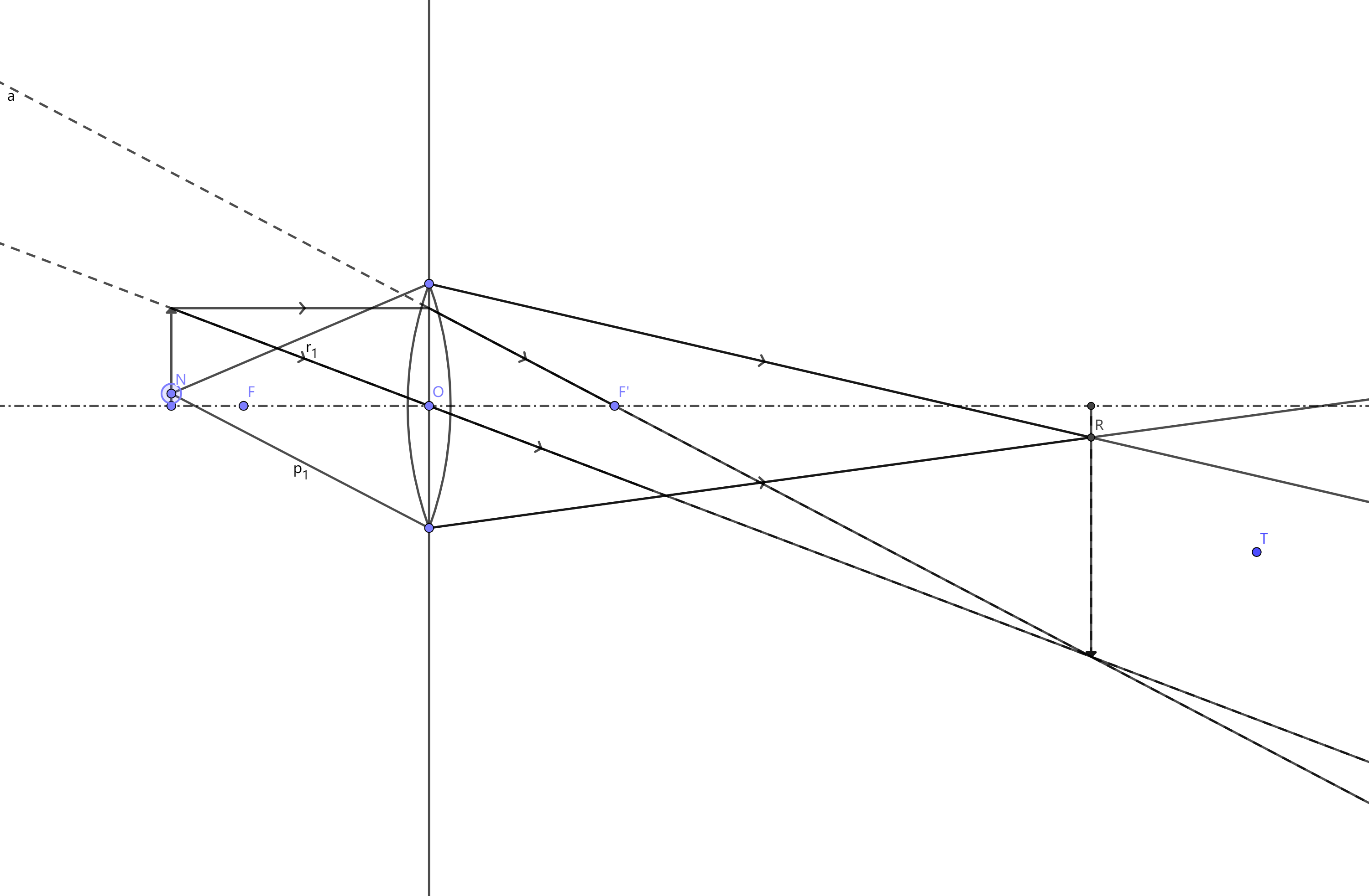 此时经过凸透镜的光线的反射延长线交于H点,这个点光源会在H点成虚像。由于光线会比原来汇聚,所以H点到透镜的距离会大于点光源到透镜的距离。 - 当点光源位于一倍焦距之外是,光线是这个样子的。